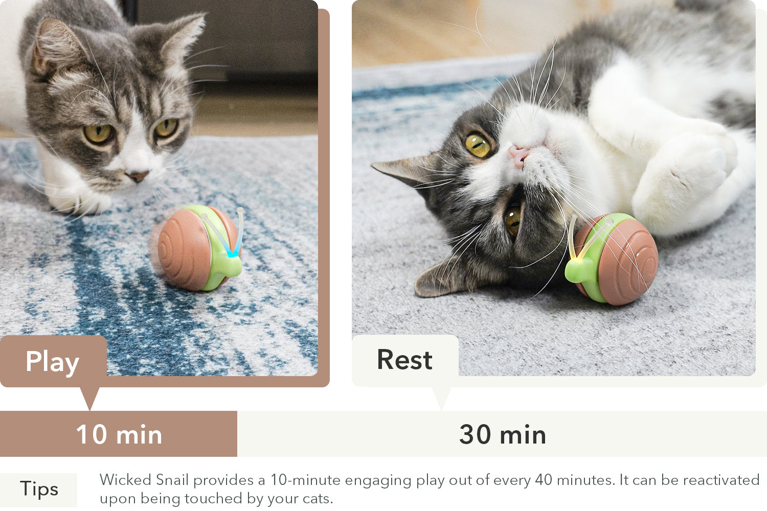 Mød SpeedySnail: et legesygt, snegleformet kattelegetøj, der handler om sjov og ballade. Den glider rundt på overraskende måder og holder din kat i gang med at gætte og være engageret. Vælg mellem Gentle eller Normal Mode for at matche din kats humør, og se den blive begejstret over de blinkende LED-lys. Det er mere end bare et stykke legetøj - det er et helt nyt eventyr for din kat, fyldt med endeløs glæde og hjernestimulerende sjov.